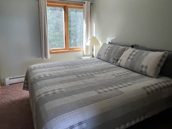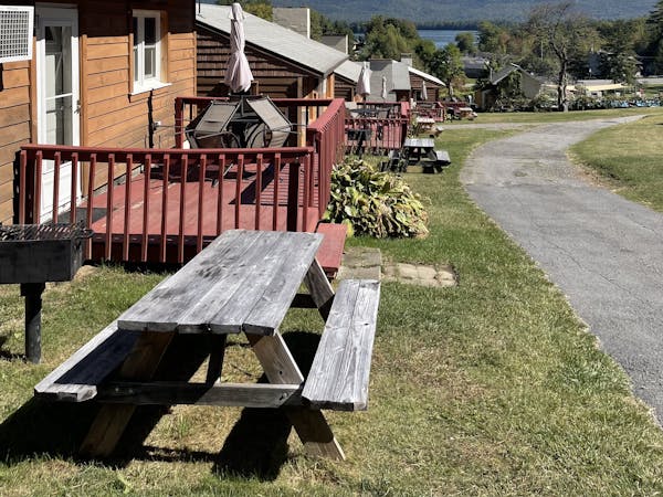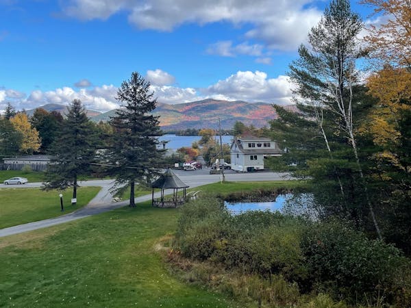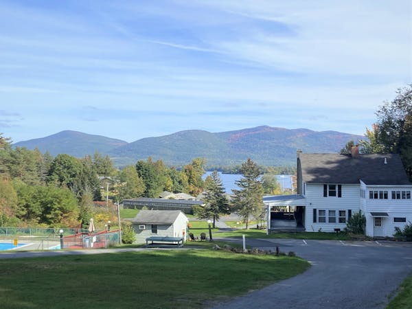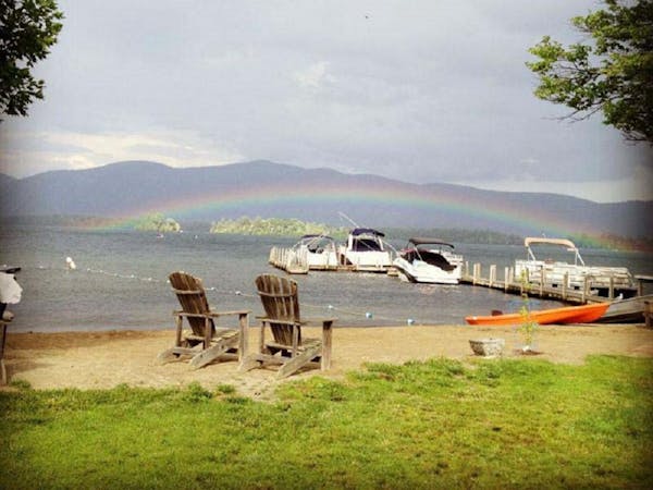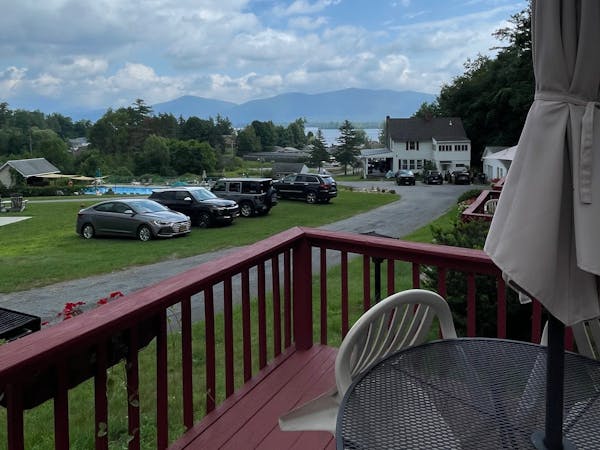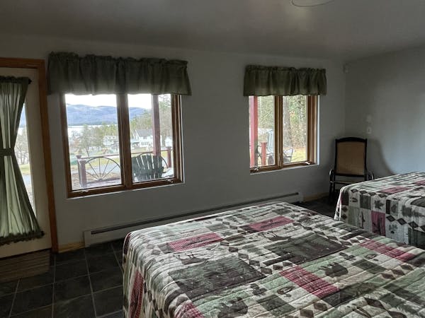Quaint 2 bedroom Chalet with beautiful views of Lake George and the surrounding mountains. The Chalet is pet friendly. This unit is part of a resort with a heated pool, Lake George beach access a short walk away and across the street, and other amenities. Unit has 2 bedrooms a full kitchen, dining area, living room, and laundry closet. Living room has a fold-out couch. Maximum occupancy is 6. There is a small deck off the front with a gas barbeque grill. Chalet is on 2nd floor requiring going up a flight of stairs. Bed linens provided. Guests provide bath and pool towels.
