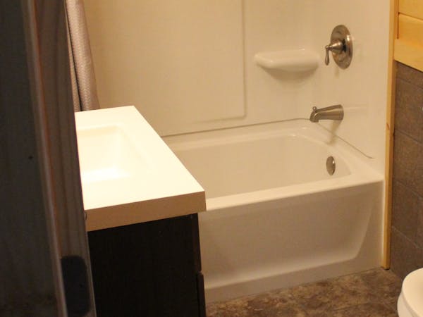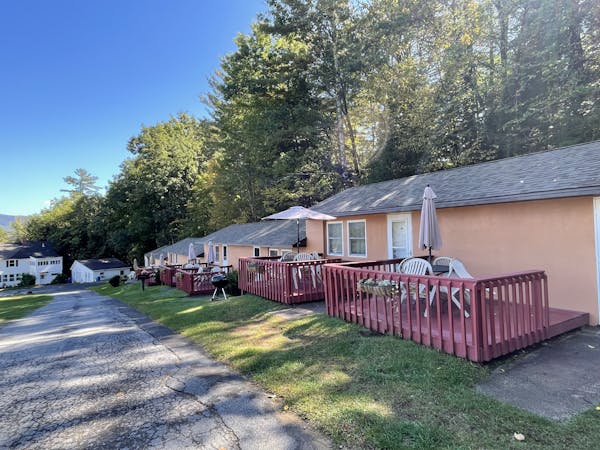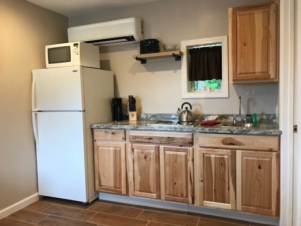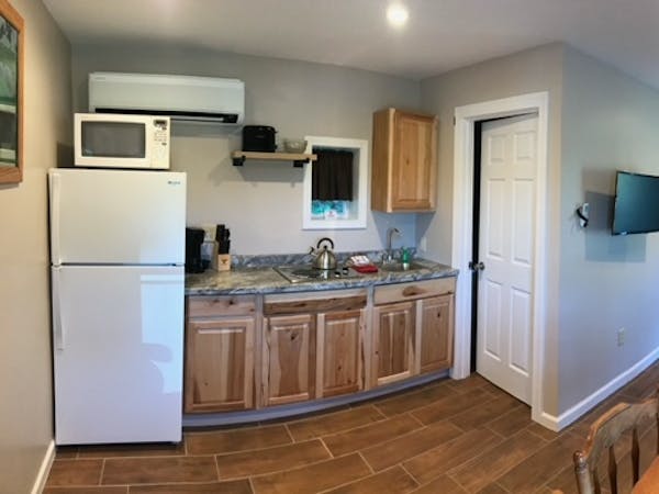 Motel Efficiency room with 2 Queen Beds. The room has air conditioning, cable TV, heat, and bathroom with stall shower. In front of the room is a private deck with beautiful mountain views and a barbecue grill. The kitchenette has a cook-top, small refrigerator, sink, microwave, coffee maker, toaster and pots, pans, and dishes.