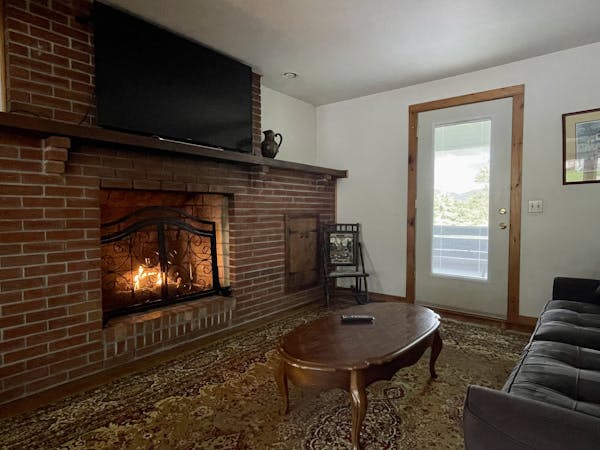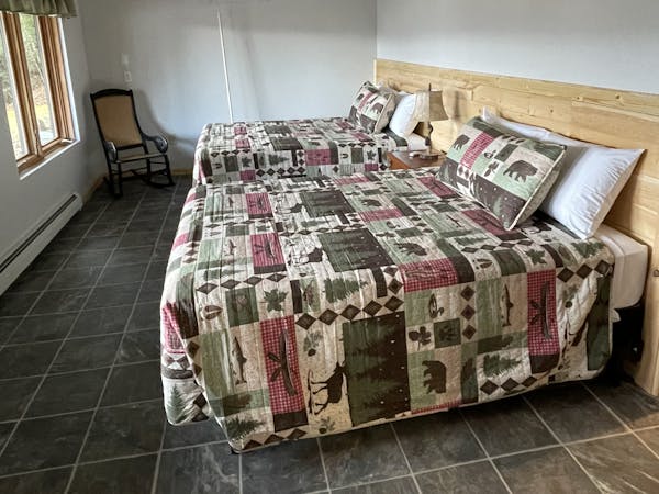 Motel room with 2 Queen Beds. The room has air conditioning, heat, cable TV, and bathroom with stall shower. In front of the room is a private deck with beautiful mountain views and a charcoal grill. The room has a small refrigerator, microwave, and coffee maker.