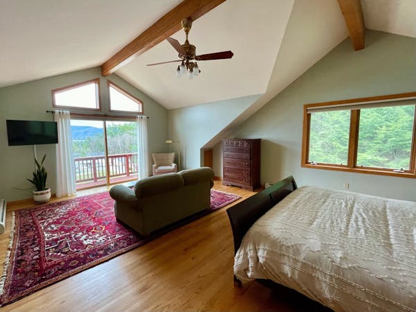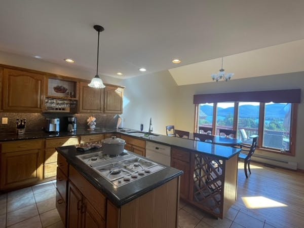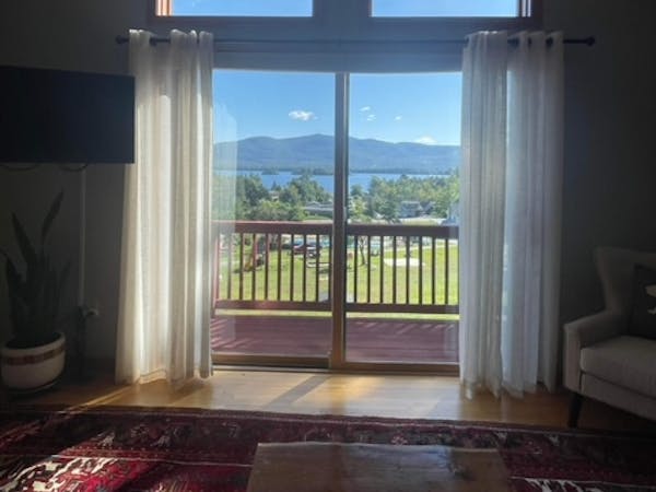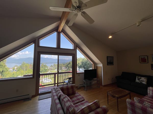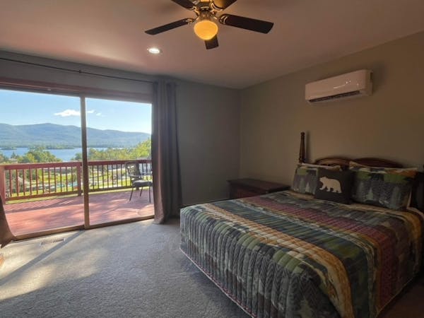 5 Bedroom house with stunning views of Lake George and the surrounding mountains. House is pet friendly. Included is Lake George beach access and access to a heated pool. House can accommodate a total of 10 guests. Included is a full kitchen with counter seating, living room with gas fireplace, a dining room plus a large outdoor covered porch with areas for sitting and dining. Beautiful views from porch. The five bedrooms are on the second floor of the house and a full bathroom is also on the second floor. There is an additional full bathroom on first floor. One of the bedrooms requires passing through another bedroom to access.