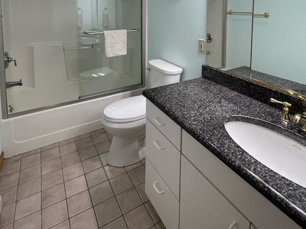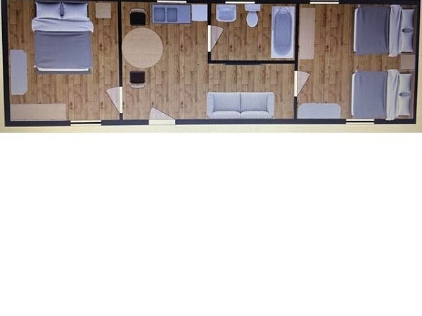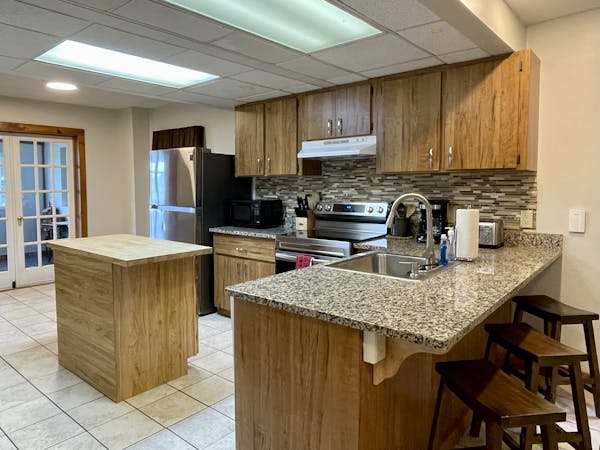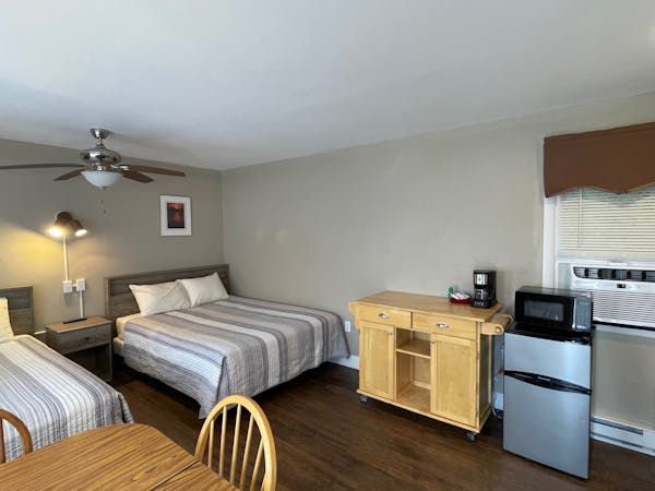 Newly renovated Suite has 2 bedrooms (1 with a Queen Bed and the other bedroom has 2 Queen Beds), kitchen with supplies, microwave, apartment size refrigerator, and cooktop. Small table with chairs for in-room dining.