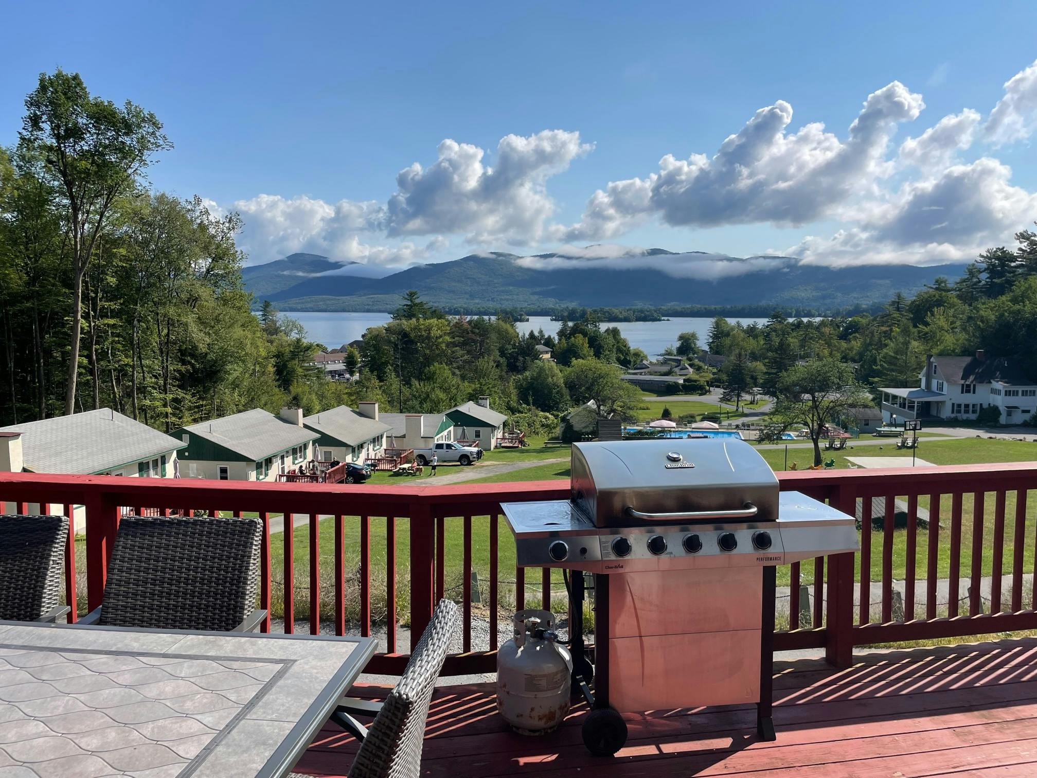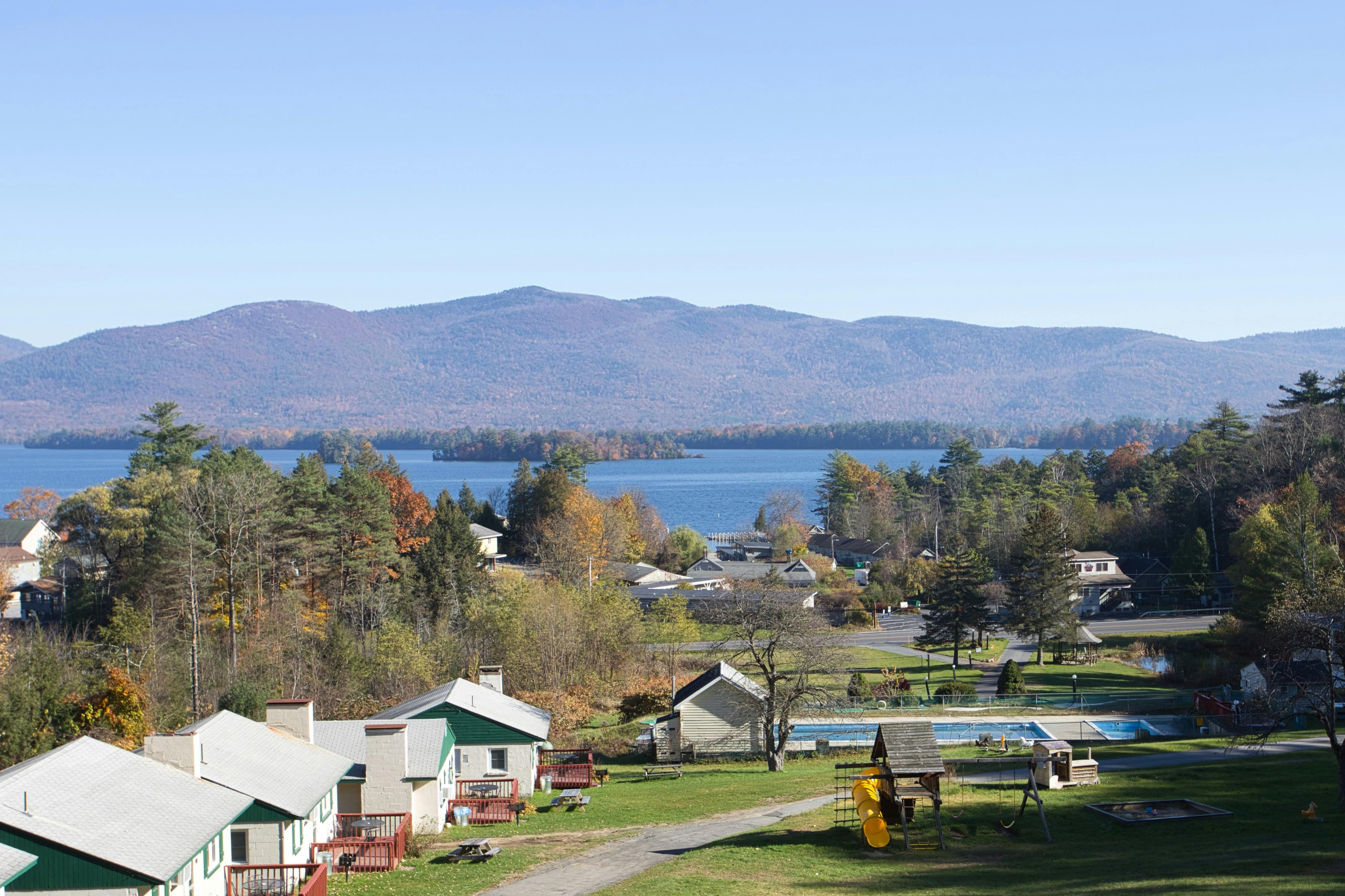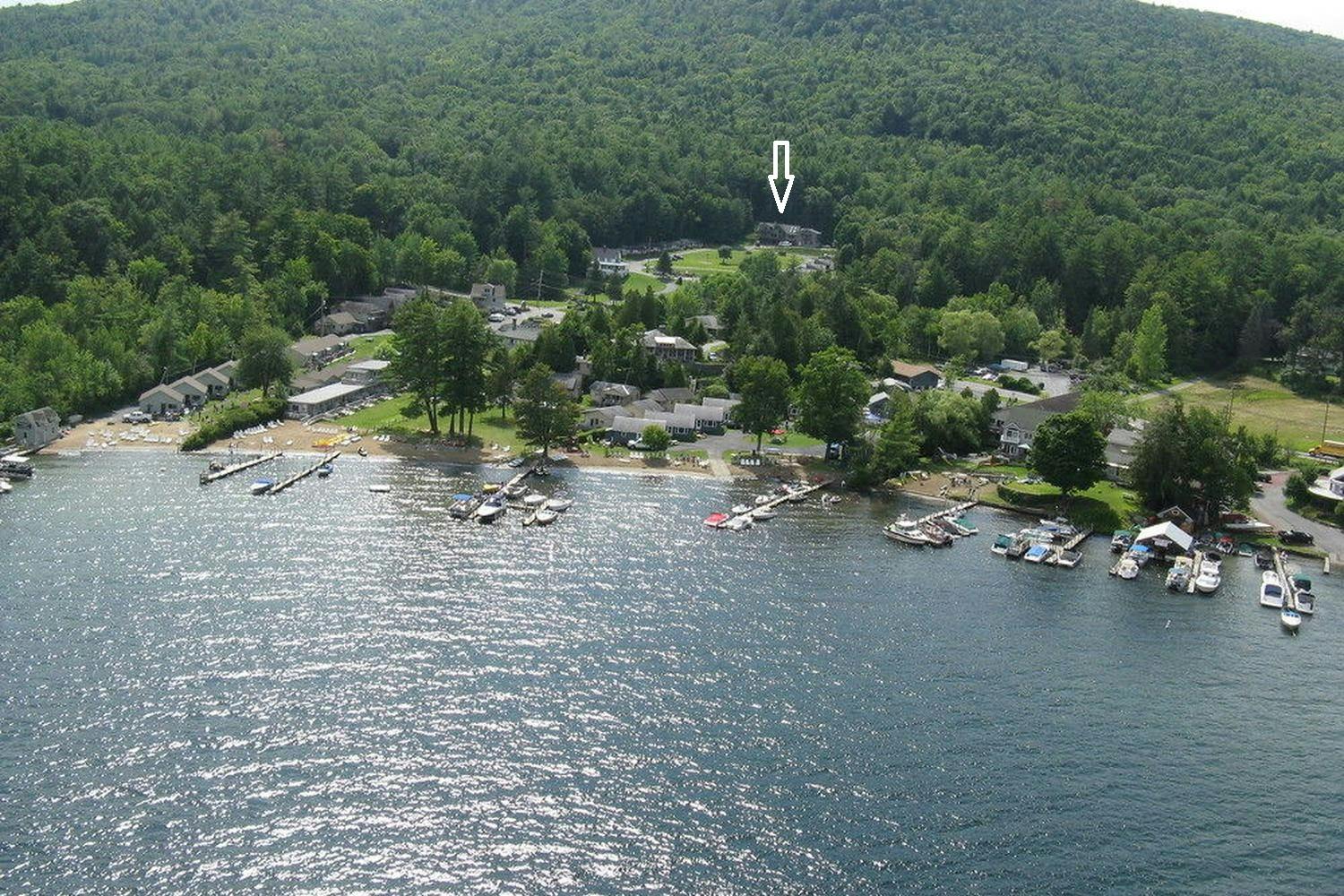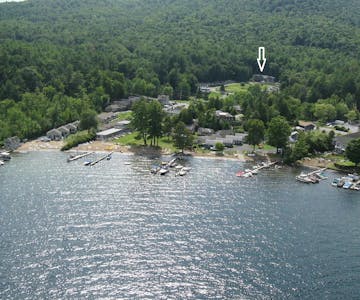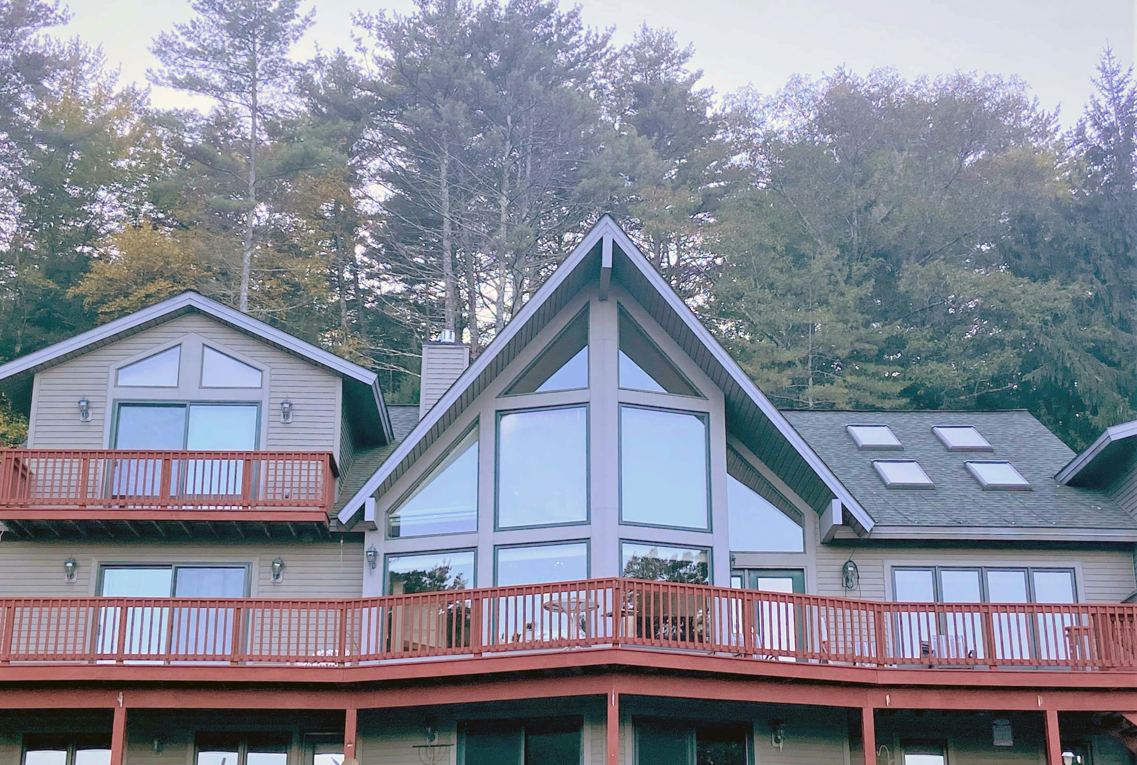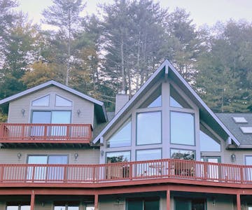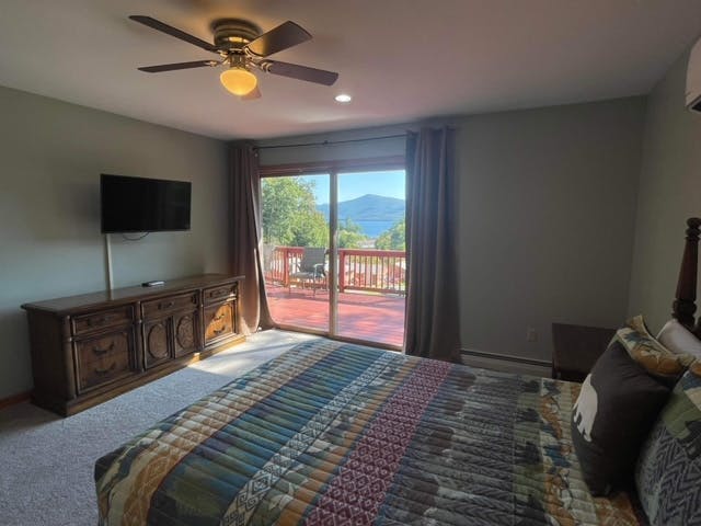 Beautiful, grand 6 bedroom house with stunning views of Lake George and the surrounding mountains. House is located at a resort and includes resort amenities such as heated pool and lake access.  NOTE:  This six bedroom house is not pet-friendly.  Lake access is a short walk and across the street from the house. House has 6 bedrooms that sleep up to a total of 14 people. Great for extended families or for families to share.  There is one bedroom with a king bed, 4 bedrooms with queen beds, and a bedroom with 2 queen beds.  Master bedroom has a balcony and an en-suite and one of the other bedrooms has direct access to the deck. House has a total of 5 bathrooms.  There are 3 full bathrooms, a bedroom with a stall shower, and 1 half bathroom. House has a large great room, a large kitchen, and 2 dining areas. Lake views are visible throughout the house and on the outdoor deck. Deck has dining and sitting areas. Access to house requires going up a short flight of stairs. Docking available for $300 per week (based upon availability.) House is conveniently located 4 miles north of Lake George Village.  Bed linens provided.  Guest provide own bath and pool towels.  Tax rate for this unit is 4%.  Tax amount will be reduced to 4% after booking.  For more information about this house visit https://lakegeorgehouseforrent.com/
